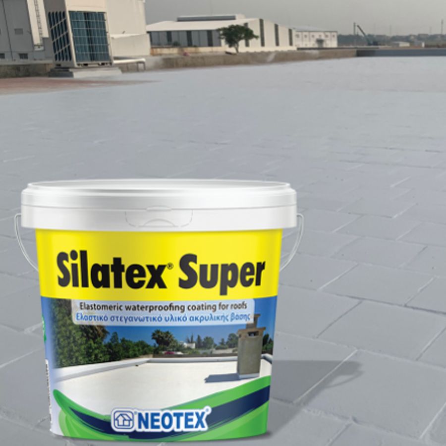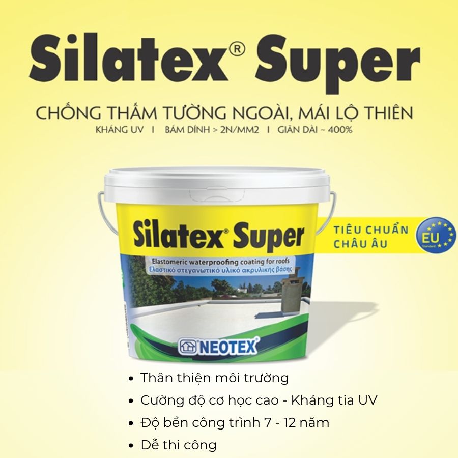 Chống thấm tường mái lộ thiên Silatex Super là vật liệu chống thấm acrylic 1 thành phần hệ nước ứng dụng cho tường và mái. Với đắc tính đàn hồi cao và khả năng chống bức xạ tia cực tím, dễ thi công, bền bỉ. Mang đến lớp màng bảo vệ lâu dài cho mọi công trình xây dựng.