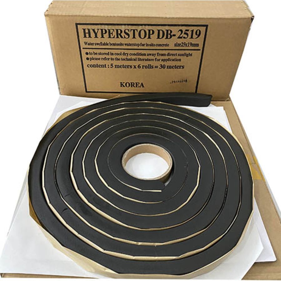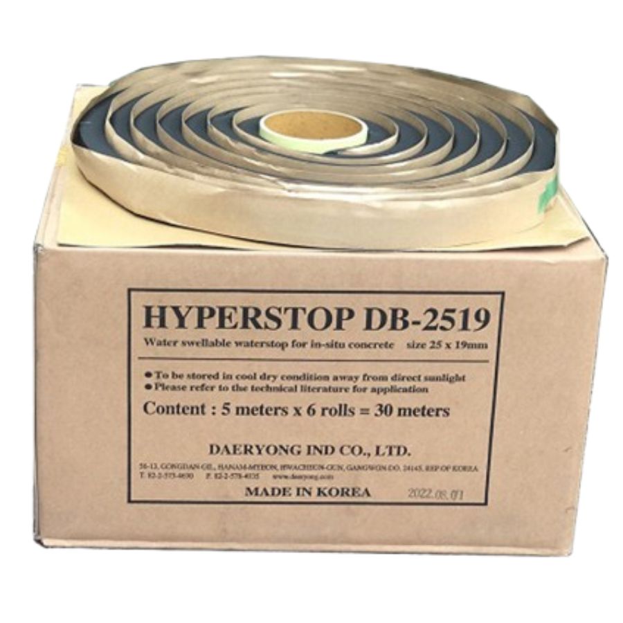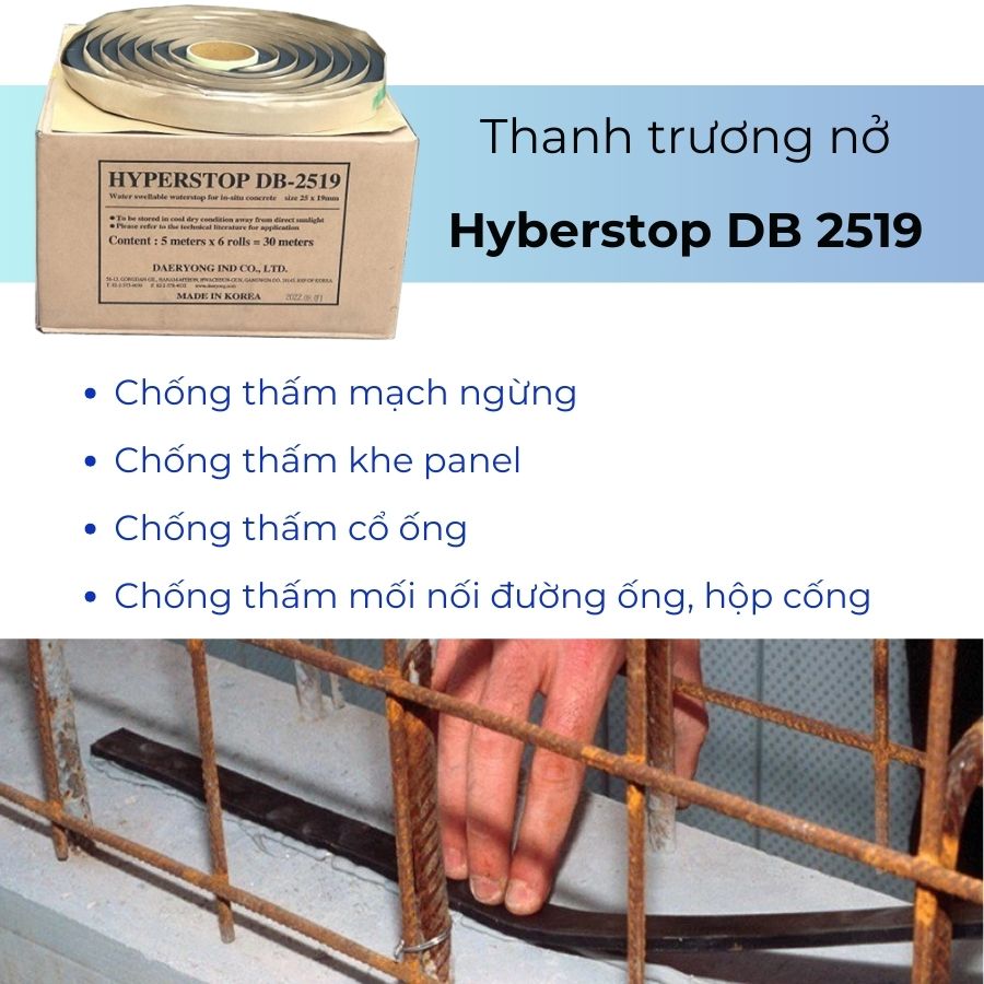 Thanh trương nở chống thấm Hyberstop DB 2519 còn được gọi là thanh thủy trương, với khả năng nở ra khi tiếp xúc với nước, chất liệu bền bỉ và dễ dàng thi công. Dùng bịt kín vị trí cổ ống, khe nối, những nơi có sự tiếp giáp giữa các phần bê tông và đường ống. Ngăn ngừa sự xâm nhập của nước vào bên trong công trình, đặc biệt là tại các vị trí dễ bị thấm dột.
